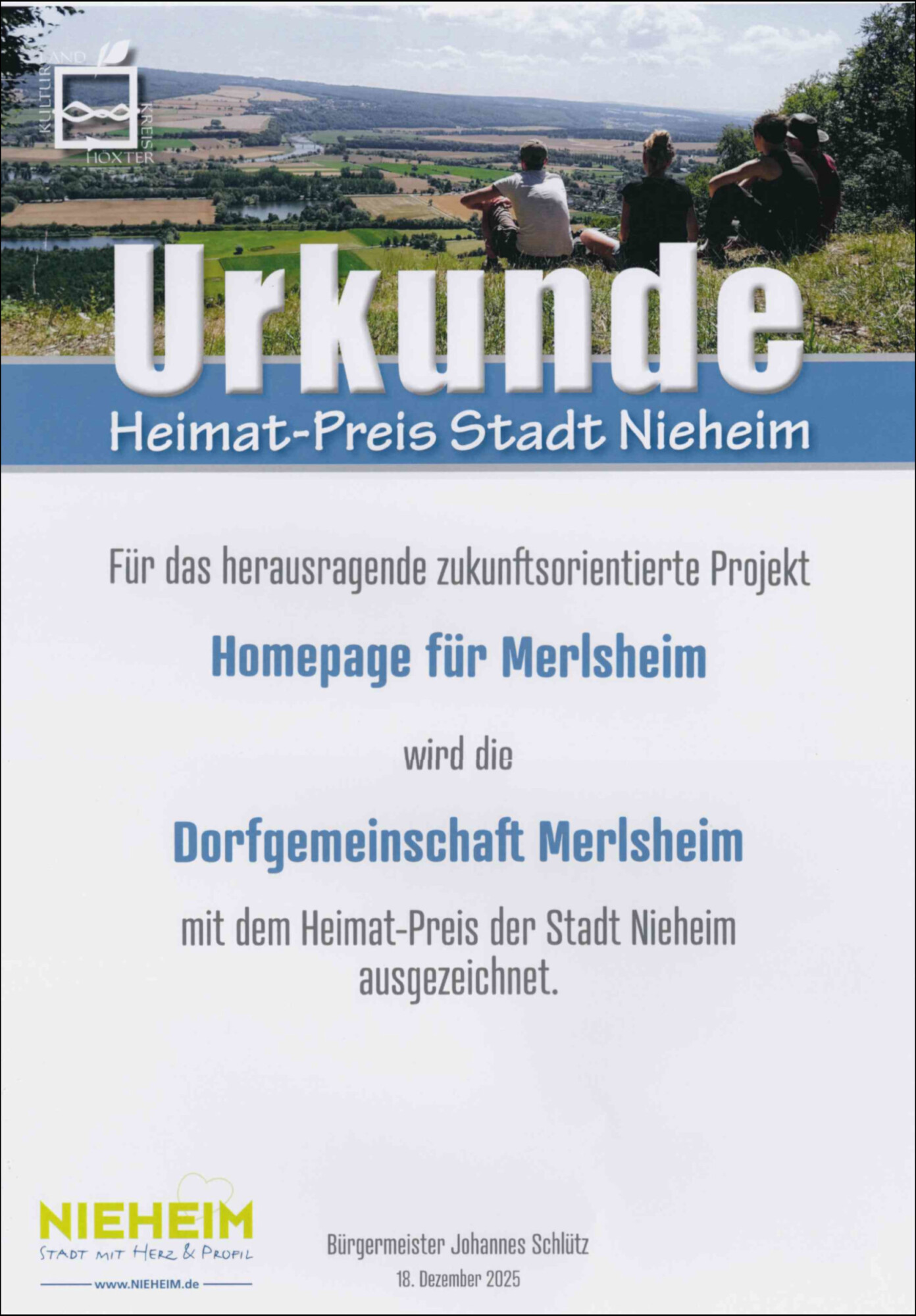 Auf dem Friedhof war der vordem geteerte Hauptweg neu gepflastert. Auch das ältere Gräberfeld ist für Behinderte barrierefrei zugänglich gemacht worden. Weitere Verbesserungen sollen in der nächsten Zeit in Angriff genommen werden. Ein Wegekreuz wurde durch die Firmlinge restauriert. Auf dem Wanderparkplatz an der Landstraße wurden in Eigenleistung ein lnsektenhotel und ein Vogellehrpfad geschaffen und Wanderwege ausgewiesen. Für die im Ortsbereich zu unterhaltenden 16 Grünflächen und Objekte haben sich Flächenpaten gefunden, die sich namentlich dazu verpflichtet haben und in einem Plan verzeichnet sind. Viele Stunden haben aktive Merlsheimer und nicht zuletzt die jungen in das Flechten einer Hecke an der L 755 investiert und werden diese „Nieheimer Flechthecke“ noch verlängern und pflegen. Das von den Vereinen gemeinschaftlich getragene „Großobjekt“ ist die für alle bedeutende Bürgerhalle.